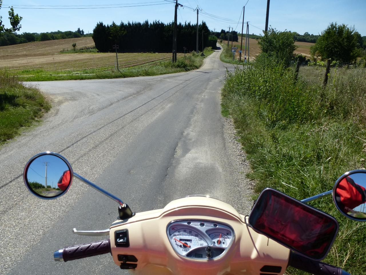 Das letzte Ferienwochenende in Frankreich bescherte mir dann noch eine böse Überraschung: Zum ersten Mal waren bei den gängigen Online-Hotelbuchern alle Hotels in 50 km Umgebung ausgebucht. Ich probierte es danach bei einem Onlinedienst, der private Unterkünfte vermittelt: Zwei Absagen bei angebotenen Unterkünften, zwei antworten nicht. Bei einer Unterkunft forderte mich der Onlineanbieter auf, in ein etwa 30 km entferntes Dörfchen zu fahren. Nach einigen Kilometern über einspurige Wege durch Weinfelder checkte ich nochmal die Nachrichten des Onlineanbieters: Absage jetzt. Im Niemandsland suchte ich erneut online nach einer Unterkunft: Nichts. Es wurde kühler, die Sonne war am Untergehen: In den Weinfeldern pennen? Liegematte und Sommerschlafsack hatte ich für Notfälle dabei, aber kein Essen, und die Aussicht, den Roller irgendwo ins Weinfeld zu schieben und dort zu schlafen, behagte mir nicht.