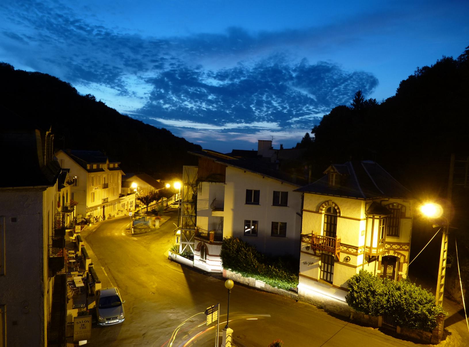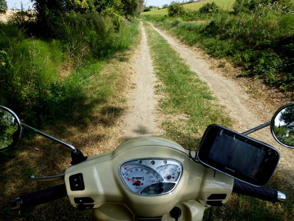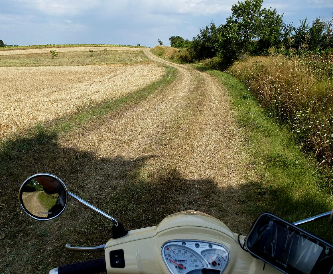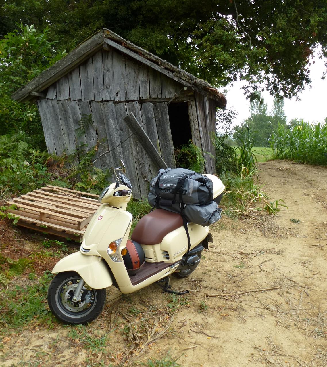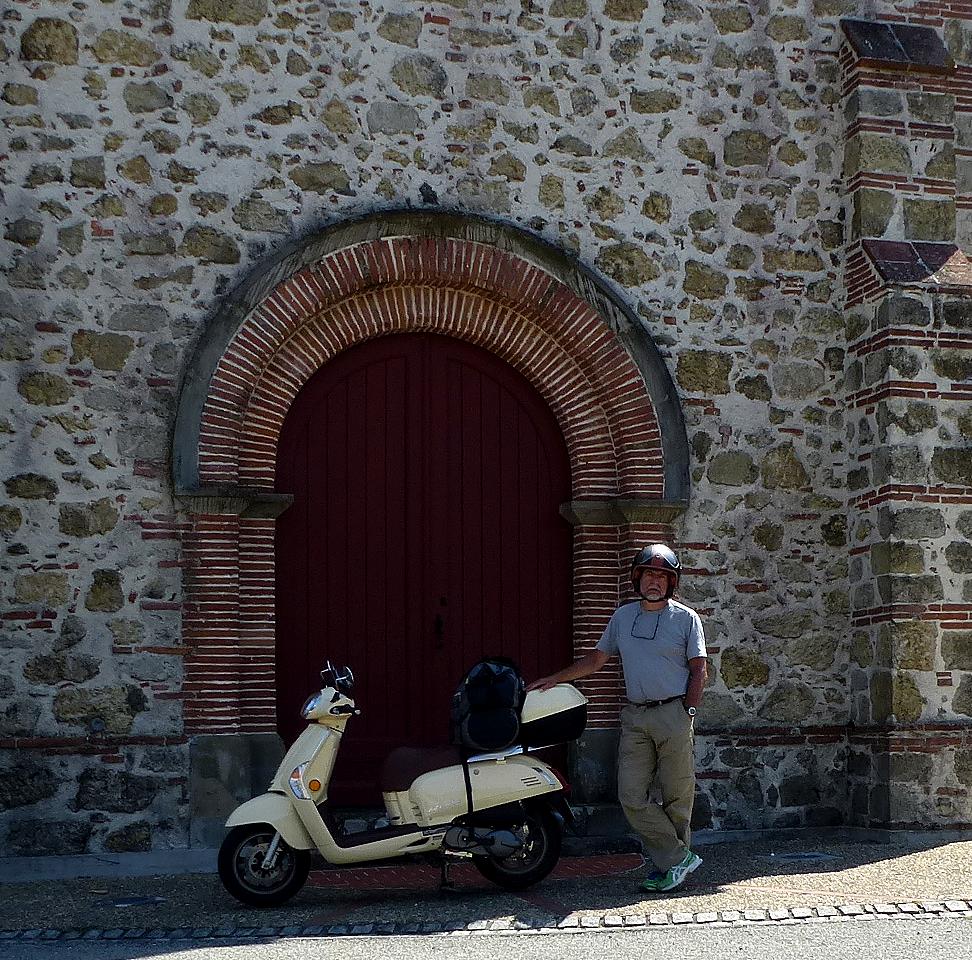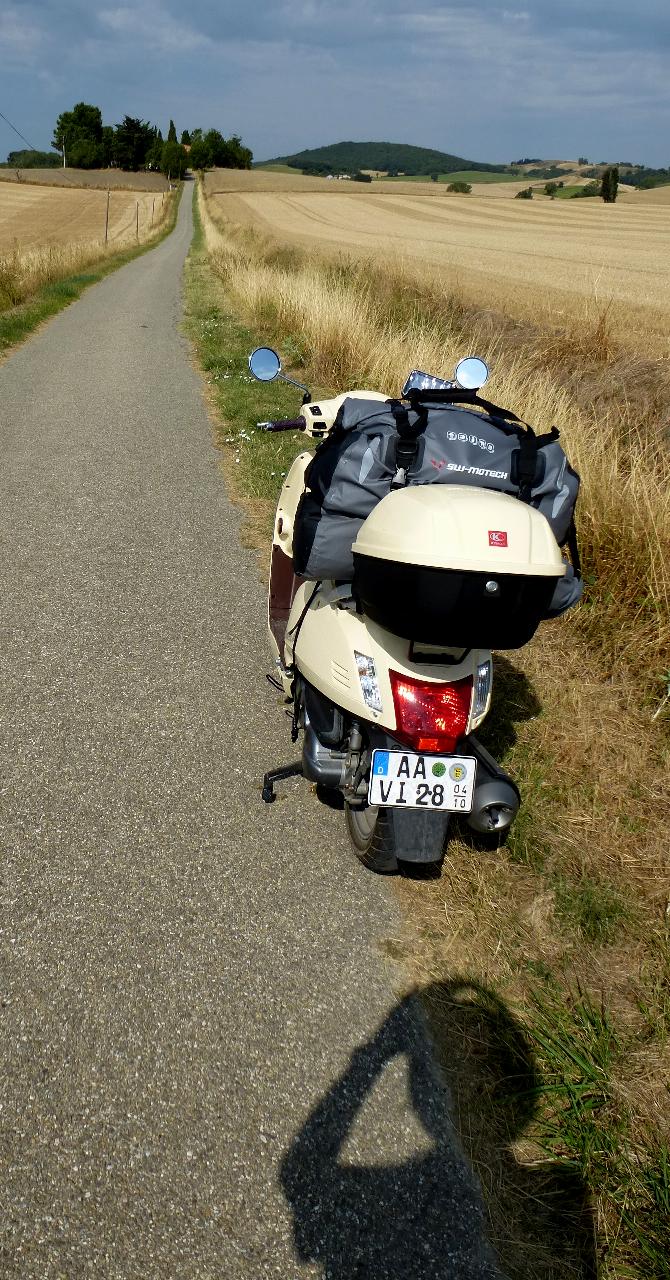 Die Fahrt von Carcasonne hierher war die bisher beste, ganz überwiegend über einsame Landstraßen und Waldwege, nur einmal für etwa anderthalb Kilometer nicht asphaltiert: Das ist unangenehm für den Roller, aber angenehmer als Route Nacional oder auch stark befahrene Kreisstraße oder gar Autobahn. Anfangs durch Wein-, später durch Sonnenblumenfelder im sonnengurchglasten heißen Nachmittag, durch dutzende landwirtschaftlich geprägte, in der Hitze menschenleere Dörfer; es hatte mehr als 35 °C. Zwischen 13 und 16 Uhr sollte man dann nicht fahren, aber wo der Hitze entgehen, und möglichst auch noch vorankommen? Ich verbringe einen warmen Vollmondabend im ruhigen Örtchen. Am nächsten Tag kostet mich ein Abstecher nach Lourdes viel Zeit. Der Ort hat mir auch kein Heil gebracht, halt doch: Ich war froh, also sozusagen heilfroh, aus dem Ort entrinnen zu können. Anderthalb Stunden irrte ich dort herum, um zur berühmten Grotte zu kommen, allein es war unmöglich: Abgesperrt, Deviation, Einbahnstraßen. Das Navi war mit seinem Latein am Ende, zum Schluss, nach geschätzt drei praktisch identischen Schleifen auf derselben Route durch den Ort bin ich über einen Hügel zum Ortsanfang zurück, um ihn auf der anderen Seite zu umfahren. Viel Rummel um nichts (Much Ado About Nothing).