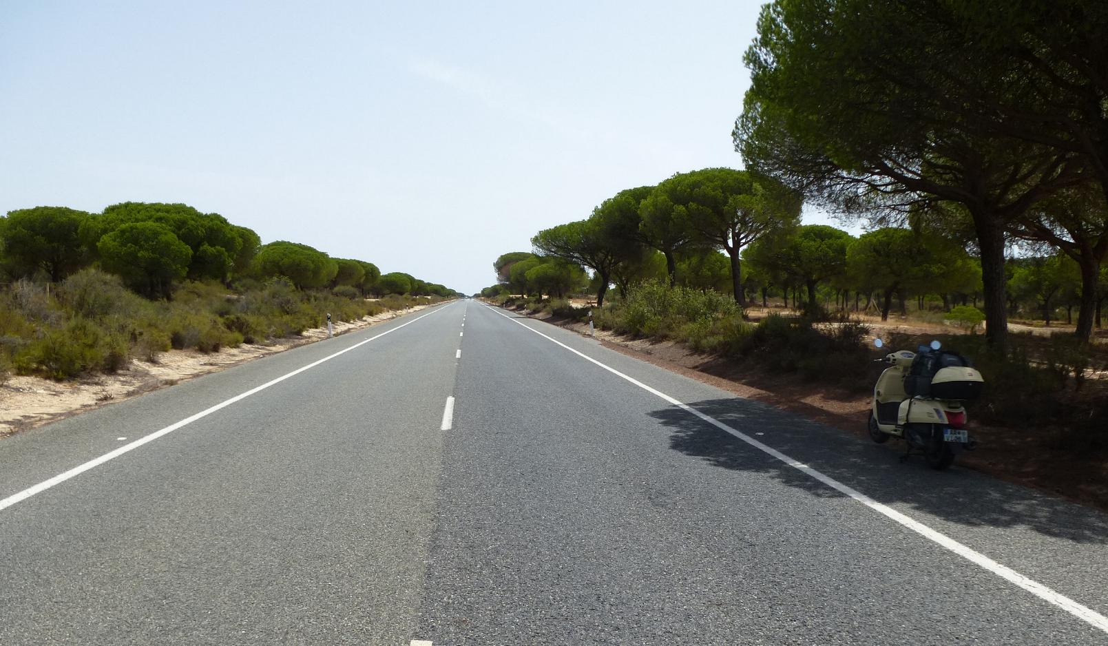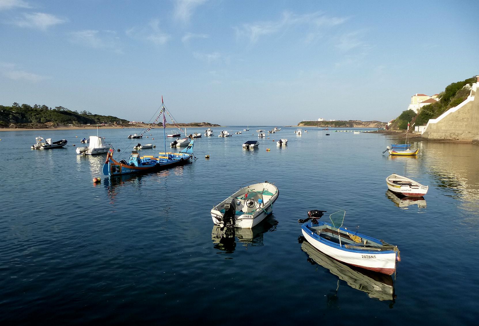 Eine beunruhigende Abhängigkeit. Anstatt mir cool gleich ein neues Mobiltelefon zu kaufen verließ ich Lissabon fluchtartig, über gerade Straßen mit wunderschönen Alleen. Eigentlich wollte ich an diesem Tag bis an die äußerste Südwestspitze der Algarve gelangen, aber da ich aufgrund der Umstände erst am frühen Nachmittag weg kam, war das nicht zu schaffen. Ich fuhr die Schnellstraße und zum Teil auch Autobahn gen Süden, musste dann aber auf der Höhe von Grândola aus Zeitgründen abbrechen und bog zur Küste ab, um gegen 19 Uhr in Vila Nova de Milfontes zu landen. Das erste aufgesuchte Hotel war voll belegt. Im zweiten gab mir im Empfang unten eine zahnlose alte portugiesische Hexe, die Spanisch verstand, zuerst den Schlüssel zu einem Zimmer ohne Dusche und Klo. Nachdem ich das festgestellt hatte, forderte ich einen weiteren Schlüssel für ein anderes Zimmer, und als ich mit diesem Schlüssel hochging und das zweite Zimmer aufschloss, erschreckte sich mit ängstlichen Schreien darin eine halbnackte ältere Frau, die das Zimmer schon bezogen hatte. Ich ging wieder runter, und vor dem Aufschließen mit dem dritten Schlüssel horchte ich vorsichtshalber an der Tür, und in der Tat, da duschte schon jemand drin. Im vierten Zimmer liege ich jetzt und habe sicherheitshalber die Kette an der Tür eingehängt.