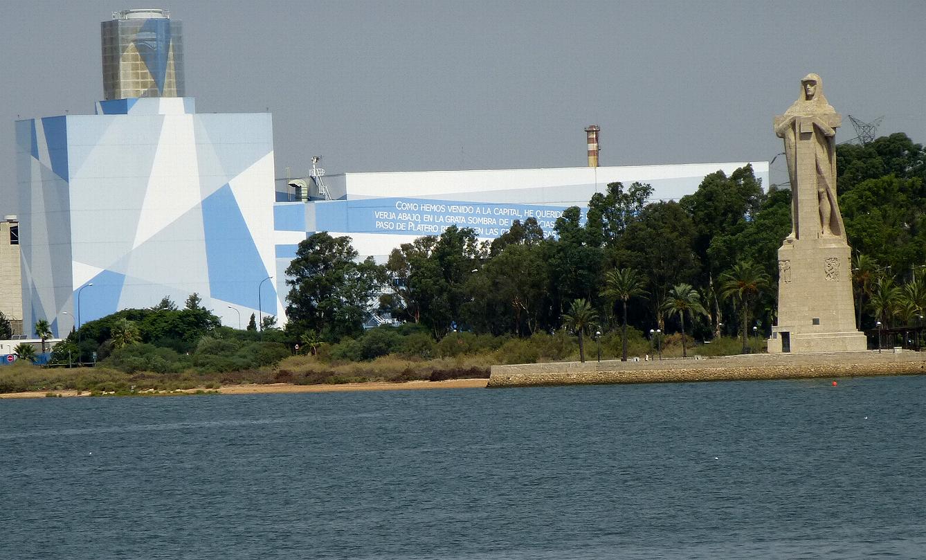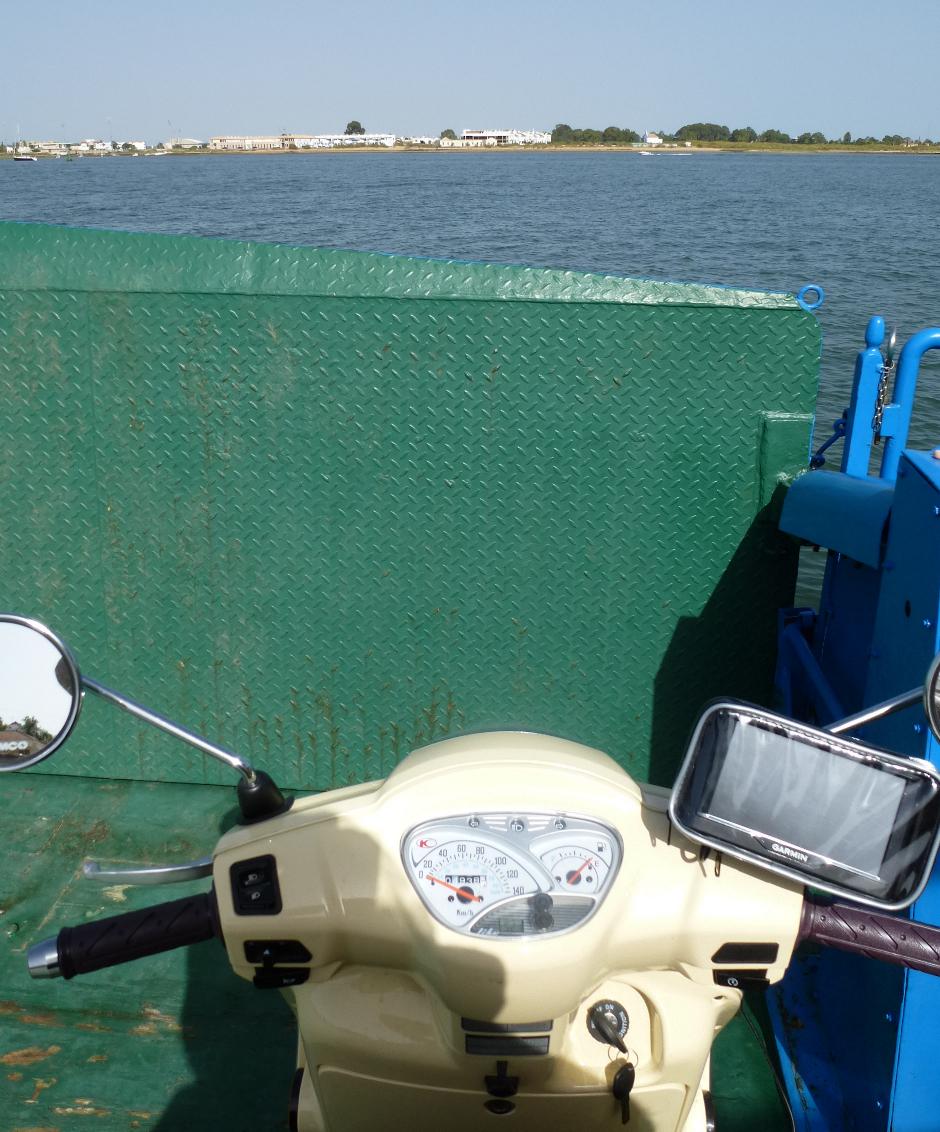 Im Grenzort Vila Real de Santo António endete die Straße am Fluss; im Navi war einfach ein Weg über den Grenzfluss Guadiana eingezeichnet. Das war aber eine Fährverbindung. Am Schalter des Fährbetriebs sprach die Angestellte kein Spanisch, und das an der Grenze zu Spanien, und es war unklar ob ich jetzt da rüber konnte, anscheinend hing das mit irgendeiner Breite auf der Fähre zusammen, ich sollte erst ausprobieren. Da nur drei Minuten bis zur Abfahrt waren und und ich nicht anderthalb Stunden auf die nächste Fähre warten wollte löste ich das Ticket. Tatsächlich war es eine Personenfähre, die nur über einen schmalen Anlegesteg mit dem Ufer verbunden war.