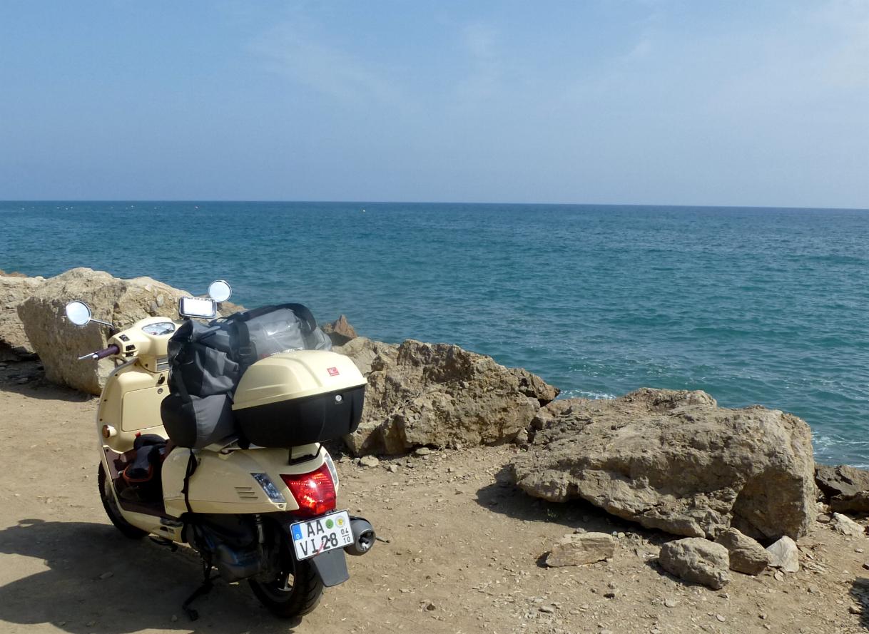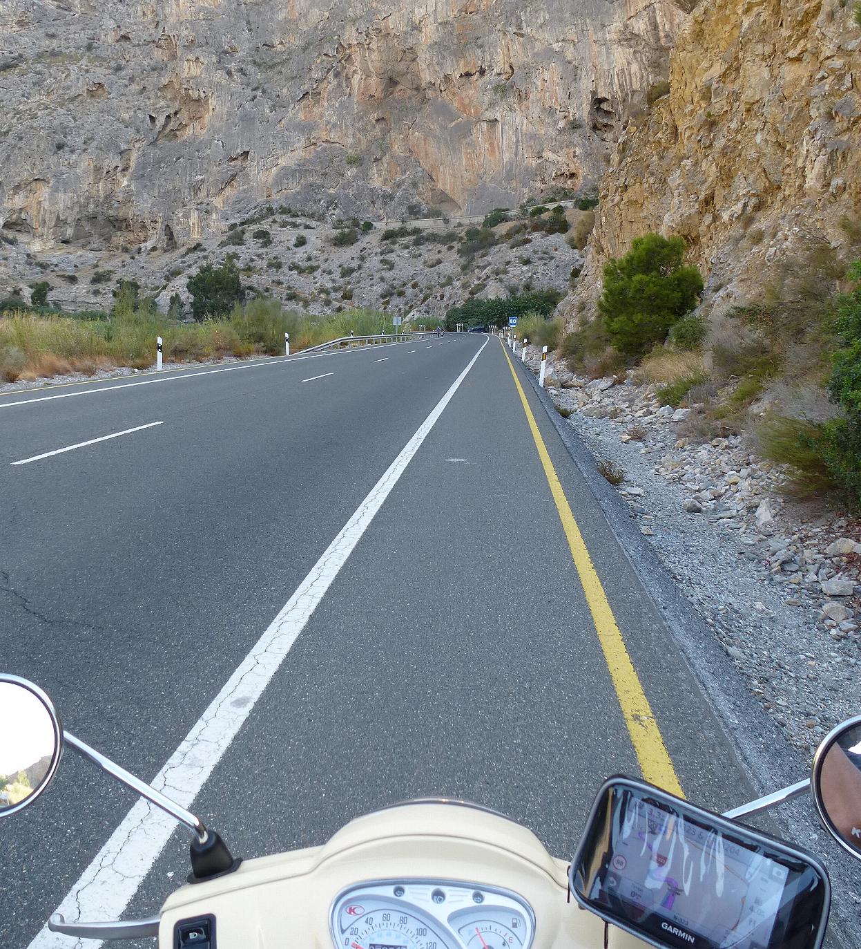 Dann beginnen links und und rechts von Torre del Mar die Bettenburgen: Links der Bettenburgbetonklotz, direkt daneben die Hauptstraße, und rechts neben der Straße der Strand. Viele Kilometer weit, mit die Straße überquerenden Touristen. Nur hinter Gibraltar und kurz vor Nerja, als ich die Schauze voll hatte von der Autobahn und den ohne seitlichen Abstand überholenden Autos, war die Strecke schön. Der Rest war harte Arbeit, und fast 7 Stunden Fahrerei brachten nur 225 km ein.