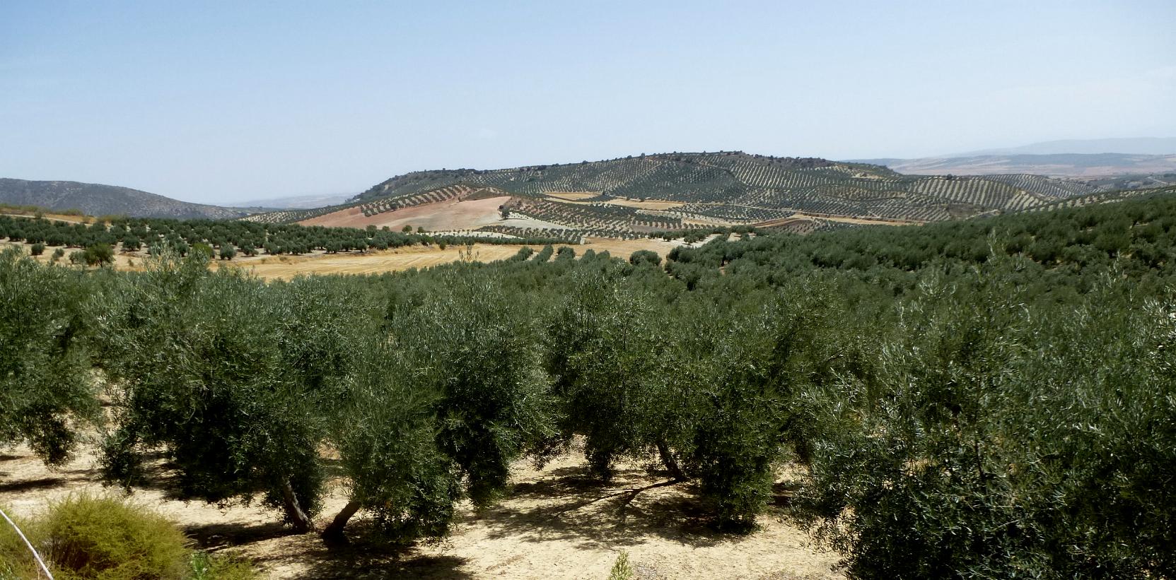 Die Fahrt dorthin ging durch das größte Olivenanbaugebiet Europas, geschätzt 150 km durch Olivenhaine, Oliven weit und breit, das müssen hunderte Quadratkilometer sein. Wie das geerntet werden soll, kann ich mir überhaupt nicht vorstellen. Schmale kurvige Sträßchen, nur etwa alle halbe Stunde begegnet mir ein Fahrzeug. Glühende Hitze. Schattenlos; die Olivensträucher spenden so gut wie keinen Schatten. Die Straße stundenlang schattenlos. Hier hätte ich nicht gerne eine Panne gehabt. Nach acht Stunden Rollerfahren hatte ich das deutliche Gefühl, dass linke und rechte Hand am Lenker nicht auf gleicher Höhe sind, sondern dass die rechte Hand mit dem Gasgriff etwa 10 cm tiefer liegt.