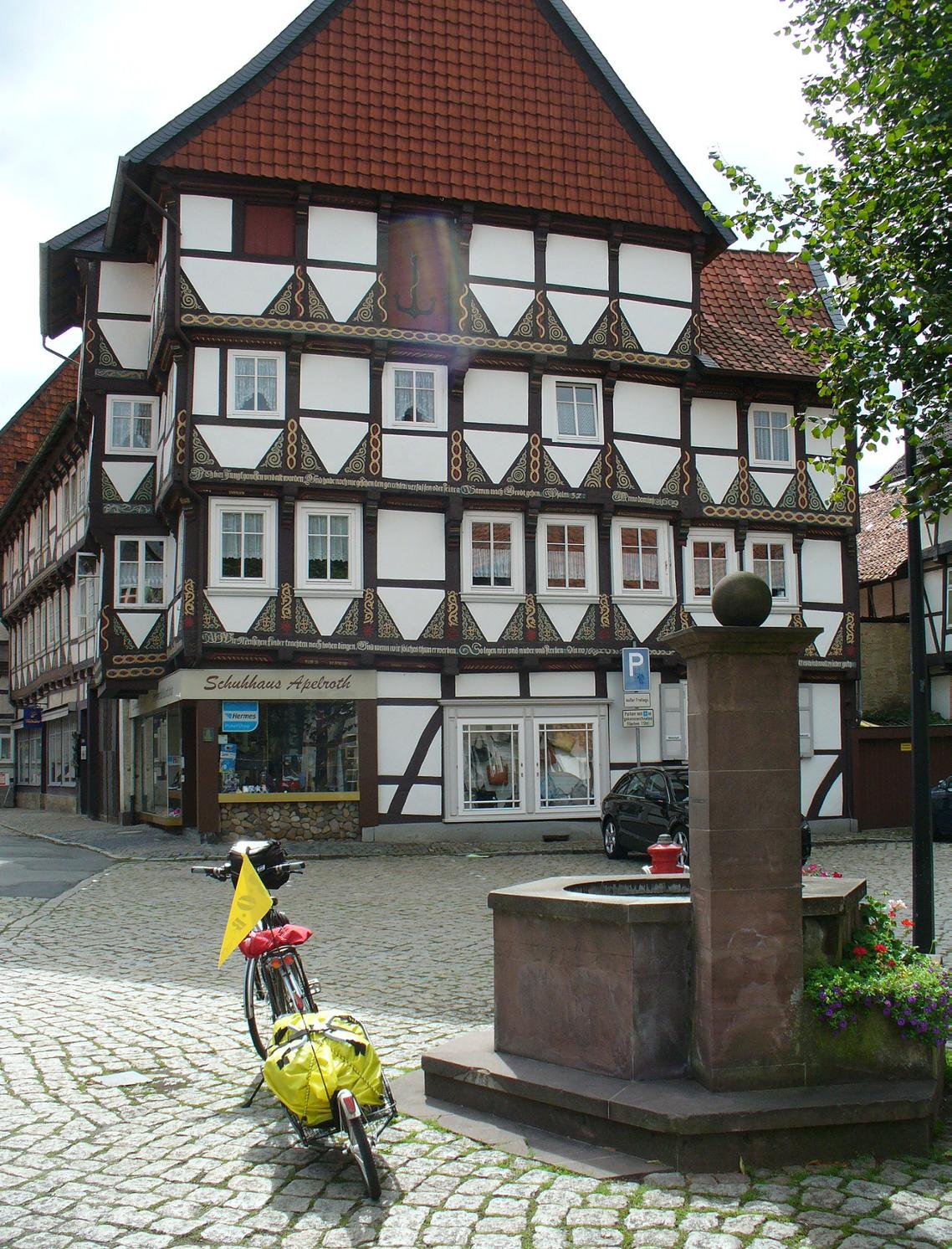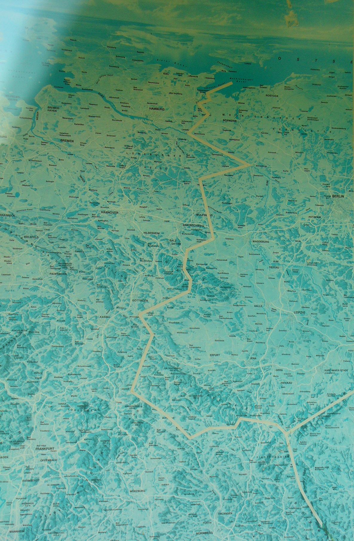 Radlerisch erst die gute Nachricht: Es hat nicht geregnet. Ansonsten: Mäßiges Vergnügen bei Wind schräg von vorn und bei schlechtem Untergrund. Nach dem Grenzdenkmal Hessendamm fehlt jeglicher Wegweiser, und einige Kilometer vor Hornburg verliere ich das Gefühl für die Länge der Feldwege und Zuordnung der Dörfer links und rechts am Horizont zur Landkarte, und fahre hin und wieder zurück und wieder hin und starte auch zwei nutzlose Versuche zu queren, um wieder auf die richtige Route zu kommen; fünf Kilometer vergebliche Mühe bei starkem Gegenwind.