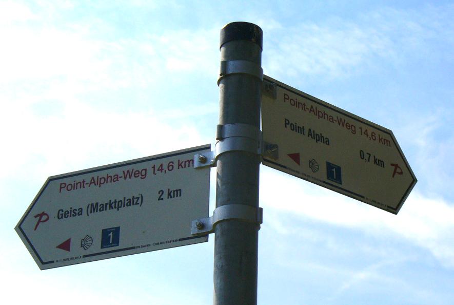An der Brücke der Einheit und dem Haus Hoßfeld (Wikipedia: „Während der Zeit der innerdeutschen Teilung gewann das Gebäude der ehemaligen Druckerei Hoßfeld Berühmtheit, weil die innerdeutsche Grenze mitten durch das Gebäude verlief. Erst 1976 wurde durch eine Grenzregelung zwischen der Bundesrepublik Deutschland und der Deutschen Demokratischen Republik das gesamte Grundstück der Bundesrepublik zugeteilt.“) bin ich ohne sie zu sehen erstmal morgentlich desorientiert in die falsche Richtung vorbeigeradelt, was mir 5 km Umweg bescherte.