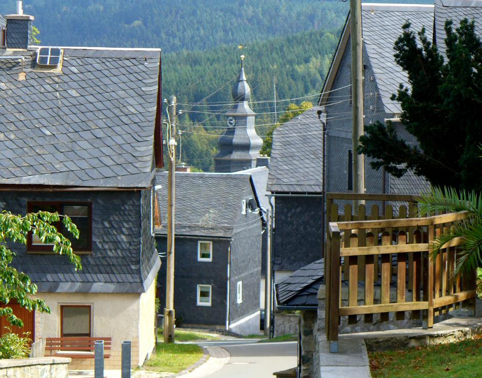 Gpx-Track: Nach der Gedenkstätte Heinersdorf-Welitsch beginnt wieder ein sehr hügeliges Gelände , anfangend mit einem Anstieg von 400 auf 800m. Karte, Wegbeschreibung und Ausschilderung sind in diesem Teilstück unzureichend, teils sogar fehlerhaft. Da das Navigationssystem oft befragt werden musste, verabschiedete sich der Akku bereits am frühen Nachmittag, nach etwa 60 km Wegstrecke. Bis dahin waren etwa 900 Höhenmeter zu bewältigen gewesen, und es kamen noch einige dazu. Viele Steigungen waren in der Karte einfach nicht eingezeichnet bzw. erwähnt; für ein Mountainbike ohne Gepäck sicher sehr schön, für ein Trekkingrad mit Anhänger und 25kg Gepäck eher grenzwertig, der Fahruntergrund teils kiesig nach dem Regen. Insbesondere ist die Teilstrecke zwischen Tettau und Blankenstein suboptimal beschrieben. Für Menschen, die nicht um alles in der Welt die Grenze auf ihrem Originalverlauf abfahren möchten, wäre hier eine Alternativroute schön, zumal so gut wie nichts von der Grenze und wenig vom grünen Band zu sehen ist. Als in der Karte als asphaltiert eingetragene Streckenabschnitten sind nicht asphaltiert, als Kfz-Straßen eingetragene sind für Kfz gesperrt. Allerdings sind mir auf den offiziellen Thüringer Radwegen mehr Autos als Fahrräder begegnet. Die einzige Übernachtungsmöglichkeit laut Radführer, ein Hotel in Hirschberg, ist seit längerer Zeit nicht mehr in Betrieb. Es war nach 20 Uhr; eine Passantin teilte mir mit, dass oben am Berg ein Gasthof sei. Dessen zwei oder drei Zimmer waren aber belegt. Der freundliche (und ungemein höfliche) Gastwirt verwies mich an eine private Übernachtungsmöglichkeit, wo ich dann auch Glück hatte. zu Tag 20