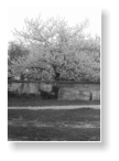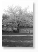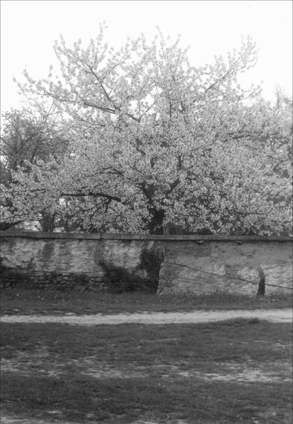 Apfelbäume stehen hier bereits in voller Blüte, neben den weißblühenden